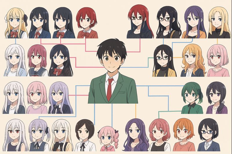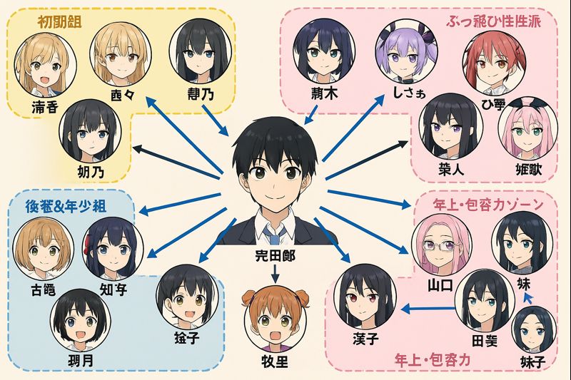 100カノの相関図って、恋太郎を中心に「恋人」って線が伸びるだけじゃなくて、彼女同士の仲良し・師弟・ライバル・主従(みたいな絆)まで“関係の味”が可視化されるのが強い。