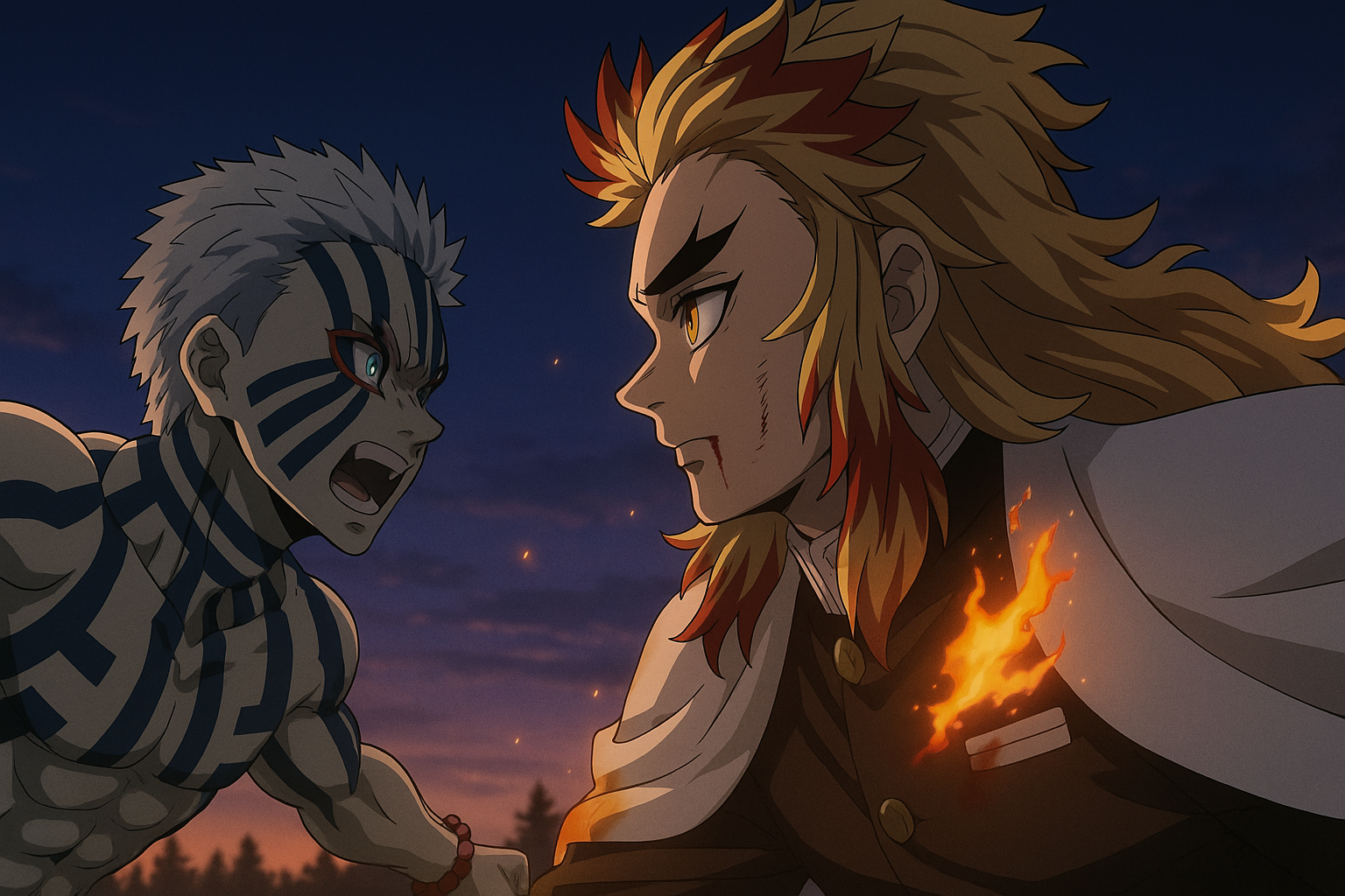 煉獄は上弦の参・猗窩座と真正面からぶつかり、仲間と乗客を守り切ったうえで、自分が致命傷を負う。