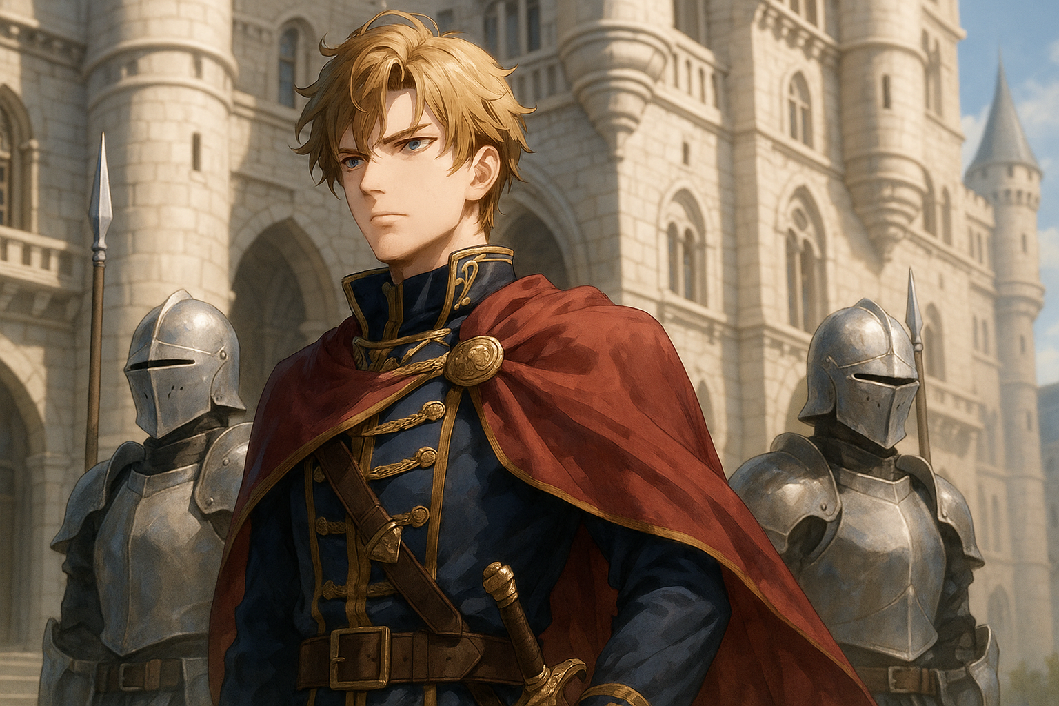 王族としての衣装、衛兵たちとの関係性、国を背負う表情の描き方など、