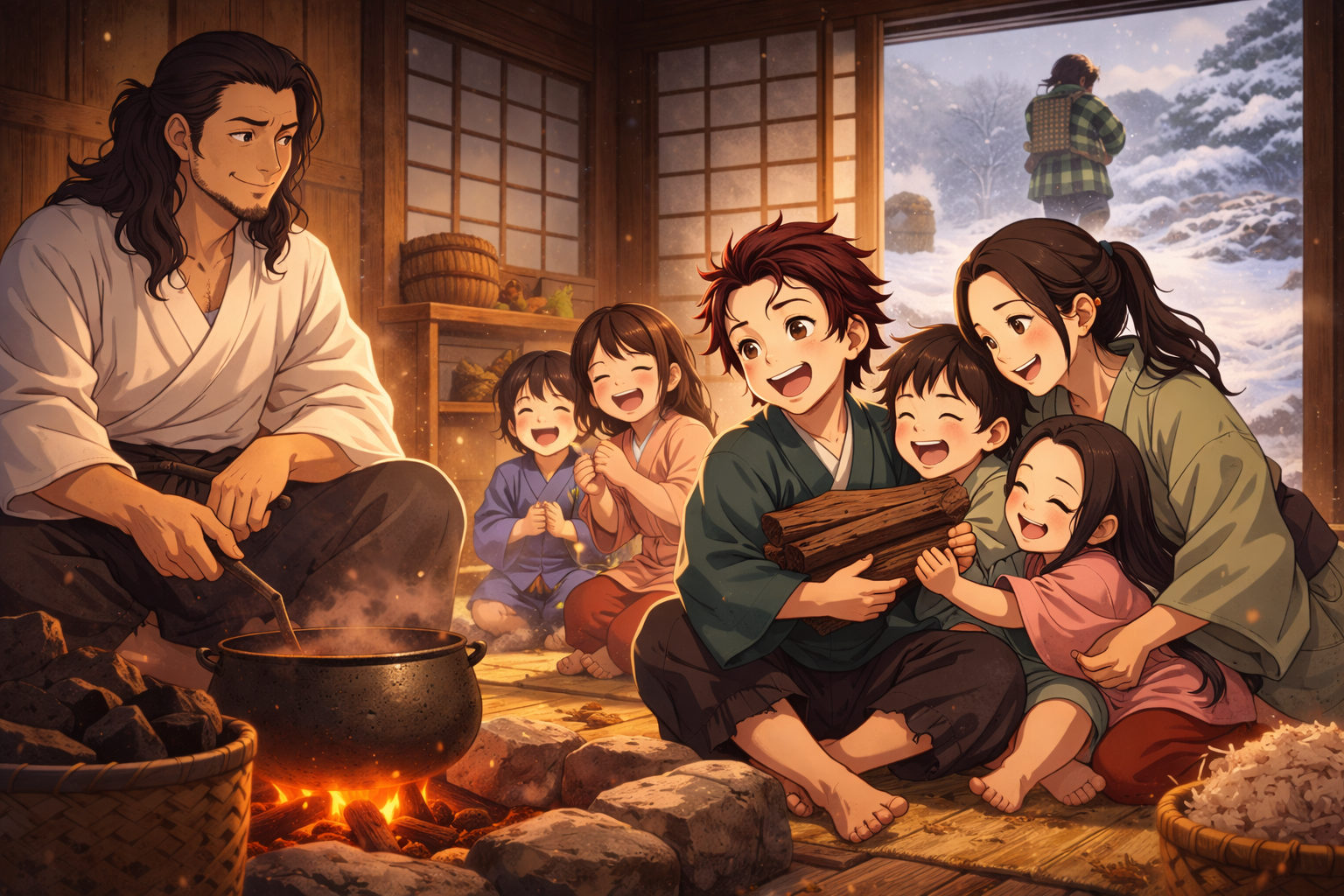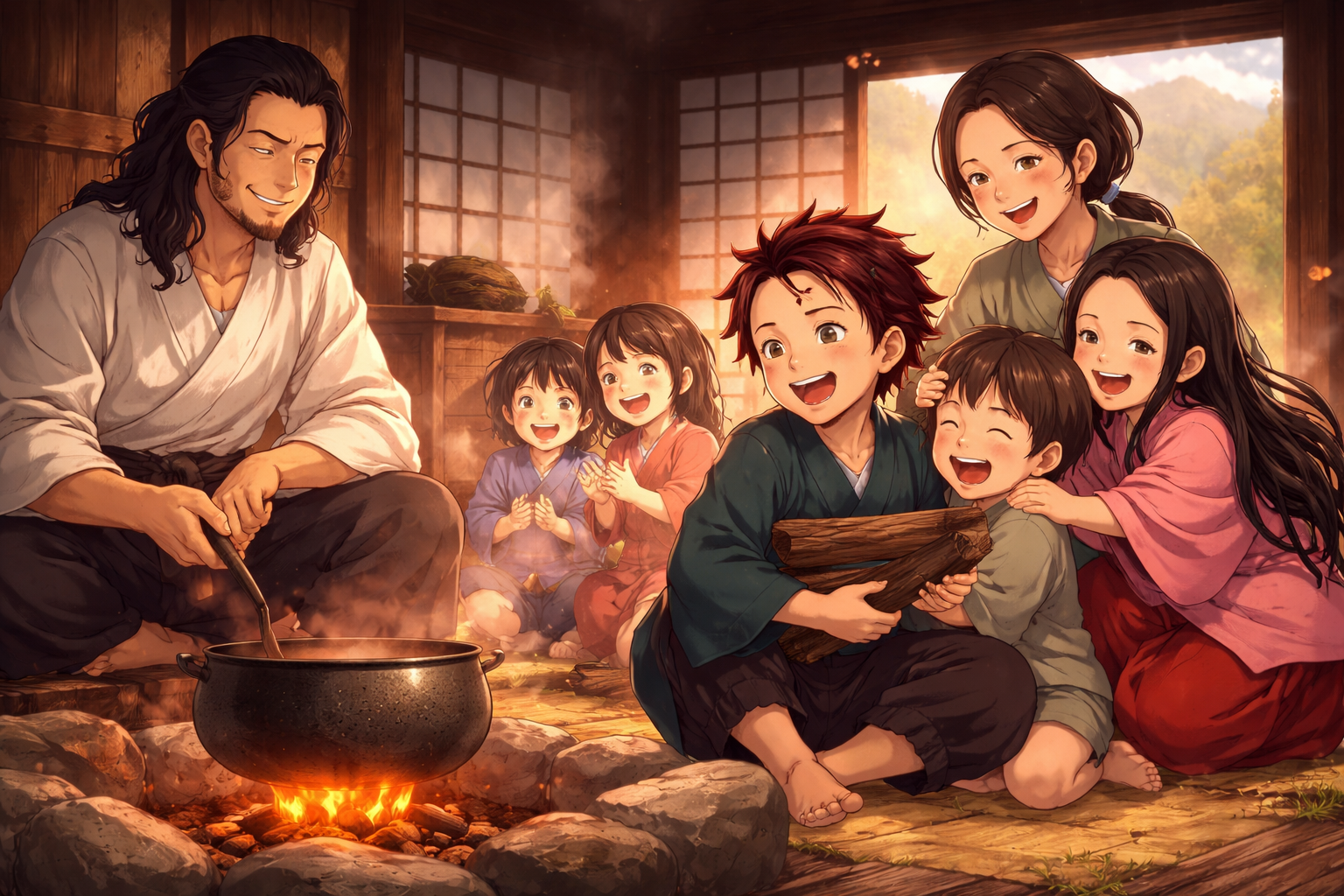 家の中で笑う、働く、気遣う、我慢する。こういう「家庭の空気」を知ってるからこそ、炭治郎は後の地獄みたいな局面でも“人を見捨てない”を選べる。