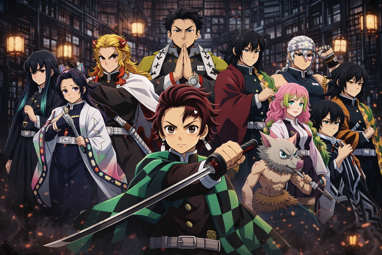 ビジュアル構図:中心は炭治郎、背後に柱が“チーム”として並ぶ