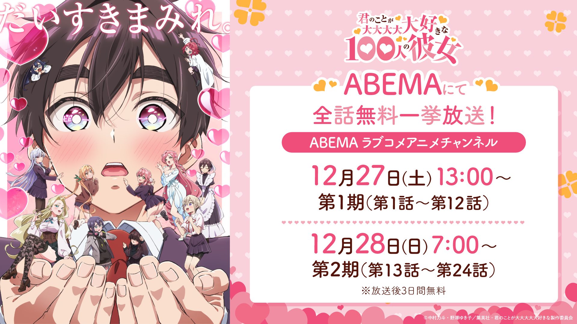 ABEMAにて『君のことが大大大大大好きな100人の彼女』第1期・第2期全話一挙放送が決定! | News | TVアニメ「君のことが大大大大大好きな100人の彼女」公式サイトTVアニメ「君のことが大大大大大好きな100人の彼女」公式サイト 原作:中村力斗・野澤ゆき子(集英社「週刊ヤングジャンプ」連載) キャスト:加藤 渉、本渡 楓、富田美憂ほか