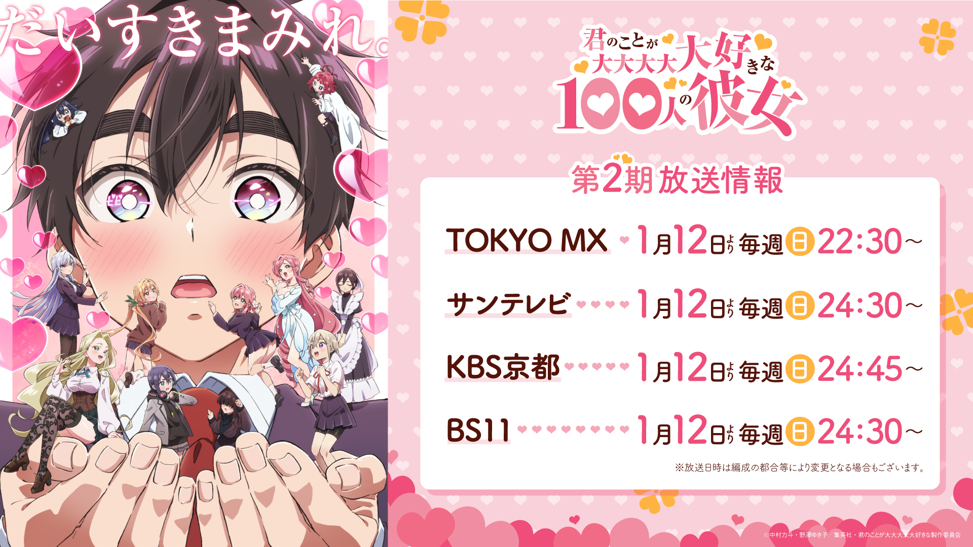 2025年1月12日(日)よりTOKYO MX、BS11に加え、サンテレビ、KBS京都でも放送決定! | News | TVアニメ「君のことが大大大大大好きな100人の彼女」公式サイトTVアニメ「君のことが大大大大大好きな100人の彼女」公式サイト 原作:中村力斗・野澤ゆき子(集英社「週刊ヤングジャンプ」連載) キャスト:加藤 渉、本渡 楓、富田美憂ほか - 公式:放送・配信情報(更新される情報の置き場):